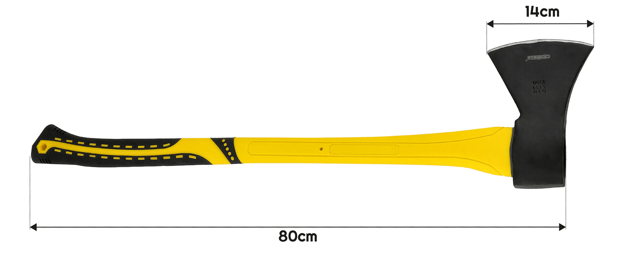 Siekiera ma optymalne wymiary, które zapewniają wygodę użytkowania oraz wysoką efektywność cięcia. Całkowita długość wynosi 80 cm, a szerokość głowicy 14 cm. Waga narzędzia to 1500 g, co pozwala na skuteczne rąbanie drewna przy zachowaniu komfortu pracy. Solidna konstrukcja głowicy oraz rękojeści gwarantuje stabilność i trwałość narzędzia, niezależnie od warunków użytkowania.