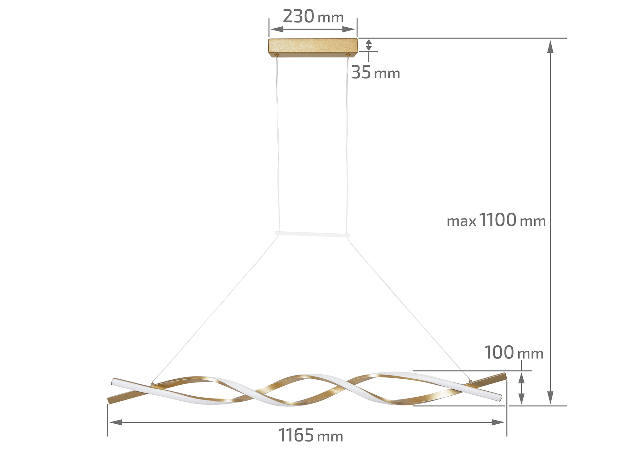 Lampa posiada wymiary 1165 mm x 100 mm, co czyni ją doskonałym wyborem do pomieszczeń o różnych wielkościach. Możliwość regulacji zawieszenia do 1100 mm pozwala na dopasowanie jej do indywidualnych potrzeb – może być montowana zarówno nad stołem w jadalni, jak i w przestronnym salonie. Smukła forma sprawia, że lampa nie dominuje wizualnie, lecz subtelnie podkreśla styl wnętrza.