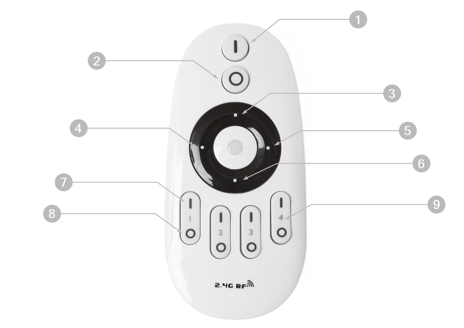 Pilot strefowy wykorzystuje technologię radiową RF, co pozwala na obsługę bez konieczności celowania w urządzenie. Zasięg wynoszący nawet kilkadziesiąt metrów umożliwia wygodne sterowanie oświetleniem z dowolnego miejsca w pomieszczeniu. Dzięki czterem niezależnym strefom użytkownik może kontrolować różne obszary oświetlenia za pomocą jednego pilota, co pozwala na pełną personalizację ustawień.