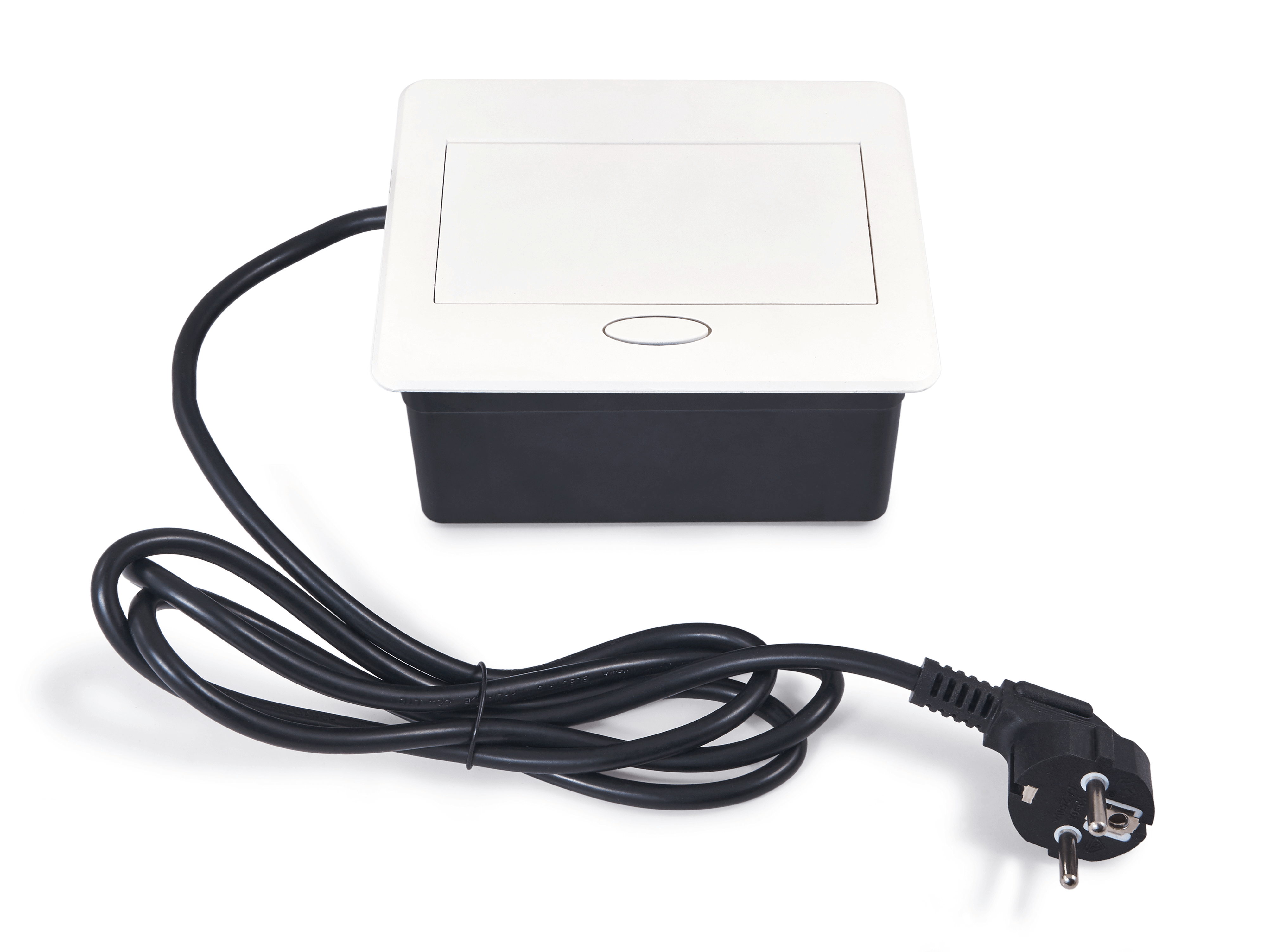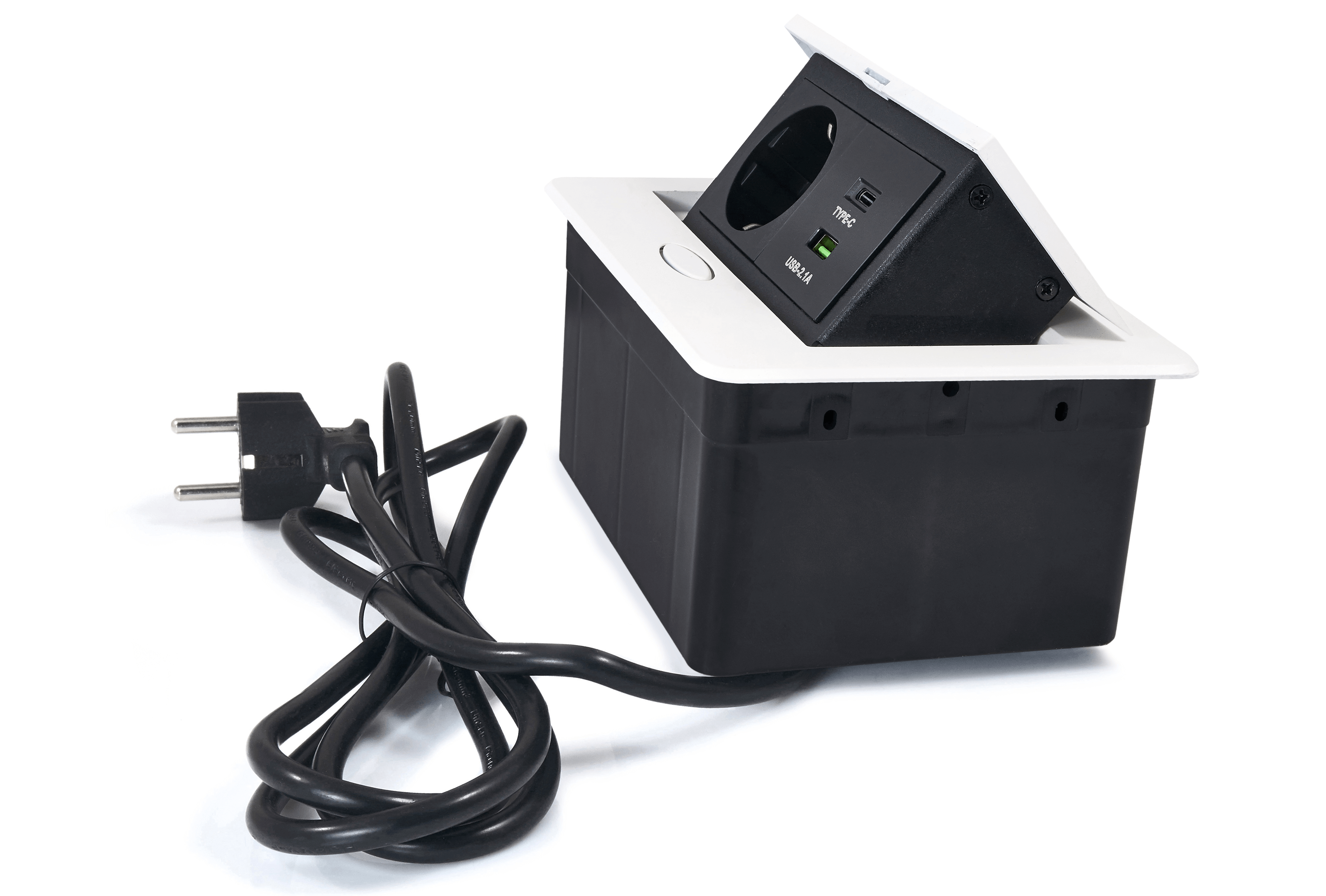 Kremowy rozdzielacz nablatowy Multibox V: 1x gniazdo 230V, porty USB-C i USB-A (2.1A). Dyskretny design, montaż wpuszczany i wygodny mechanizm Push to Open. Przewód 1,6m