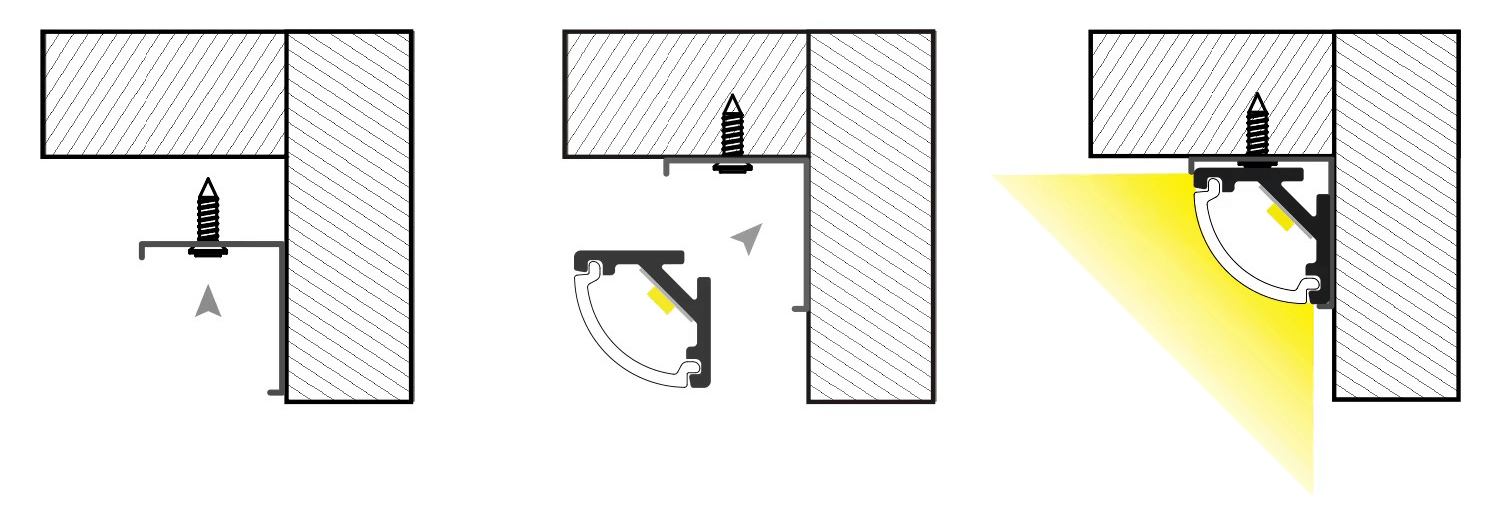 | Uwagi | Nie należy montować taśm LED IP65 w profilu z zamontowanym kloszem. Montaż taki może doprowadzić do uszkodzenia zamontowanej taśmy LED oraz klosza, jak również utratę gwarancji. |
