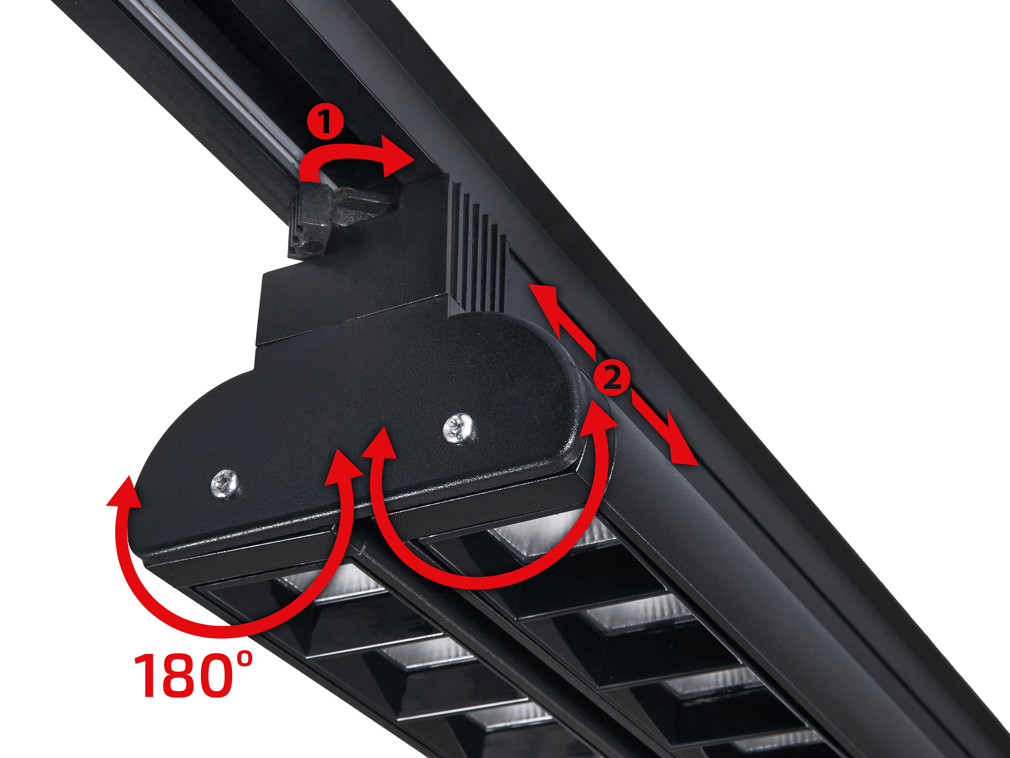 Montaż i konfiguracja systemu oświetleniowego Linda Steka jest intuicyjny i prostszy niż kiedykolwiek, co umożliwia użytkownikom szybkie dostosowanie oświetlenia do zmieniających się potrzeb. Elastyczność systemu szynowego pozwala na łatwą zmianę kierunku i intensywności światła, co jest nieocenione w miejscach, gdzie wymagana jest częsta adaptacja oświetlenia do różnych zadań i scenariuszy. Jak pokazuje zdjęcie, oprawy mogą obracać się o 180°, co pozwala na precyzyjne skierowanie światła tam, gdzie jest najbardziej potrzebne.